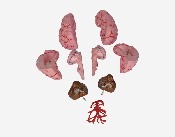 مجسم يبين أجزاء الدماغ المختلفة, الفص الأمامي والفص الجداري والفصوص القفوية والفص الصدغي و يبين شبكة الأوعية الدموية. ومكون من 9 أجزاء منفصلة