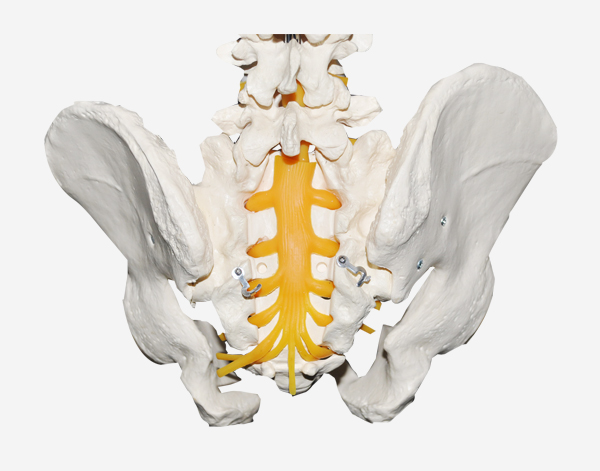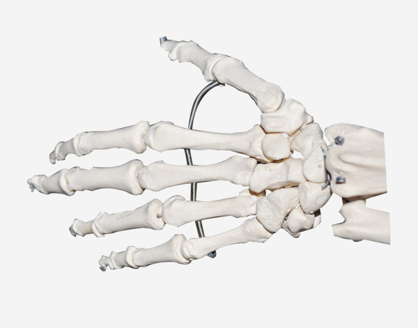 Tall: 170 cm. Correctly articulated to show the normal posture. Consists of a 3-part skull, a cut calvarium and a removable spring-held mandible. The upper and lower extremities are removable. Rod supported, on stand.