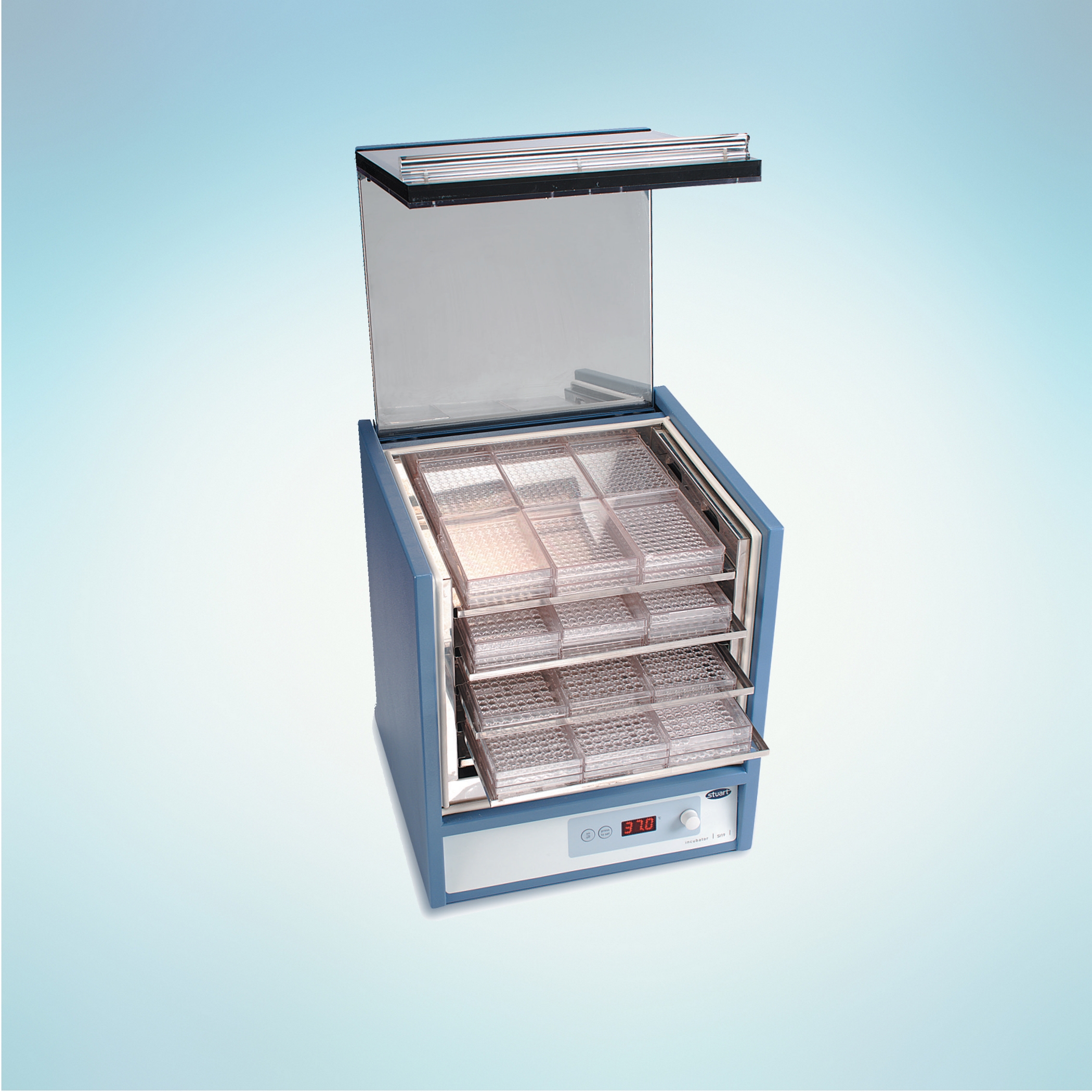 Specially designed for use with microtitre plates, which can be difficult to incubate. In conventional incubators, when 4 or more plates are placed on a shelf, they block the air circulation, which can seriously impair temperature distribution.
