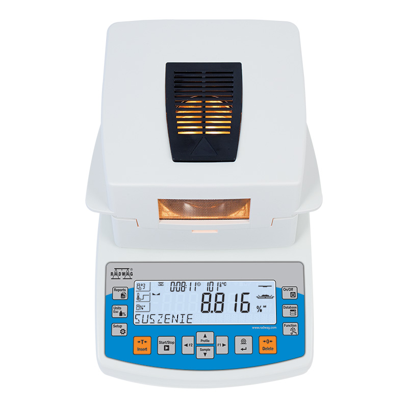 Moisture analyzer is a laboratory measuring instrument intended to determine relative humidity for small samples of different materials. MA.R series redefines moisture analyzers standards. This series has been equipped with brand new readable LCD display providing an extra text line for information such as supplementary messages and data, e.g. product name or tare value. The moisture analyzer, using respective pictograms, signalizes currently activated mode, computer connection and functions, both balance and service ones.
